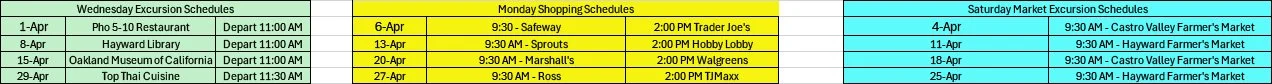 April Shopping and Excursion Schedules